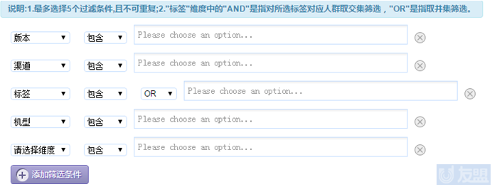 不同的维度可进行组合,取交集或者并集来推送,效果会更佳。下图是友盟推送后台的一个截图:
