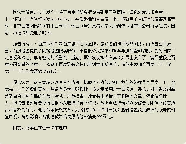 百度认为,百度地图“受到网民广泛喜爱和欢迎,享有极高美誉度”,但是“该文章缺乏客观事实依据,《百度一下,你就完了》是虚假事实,带有极大的贬损性,该文章被用户大量阅读、评论,对百度地图产品的美誉造成了严重损害”。