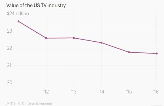 美国人购买的电视机数量也没有以前多了。市场研究公司欧睿国际(Euromonitor International)的数据显示,2017年美国电视机市场规模为217亿美元,较5年前下降大约8%。(但欧睿国际消费电子研究员指出,得益于全新的超高清机型的出现,全球范围的电视市场呈现反弹,规模较去年增长4%。)