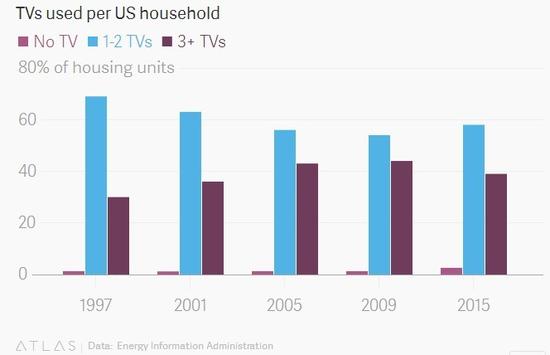 根据美国能源信息管理局的最新数据,没有电视机的家庭比例正在攀升。目前,美国家庭平均拥有2.3台电视机,低于2009年的2.6台。拥有3台或以上的电视机的家庭比例则创下2001年以来的新低。