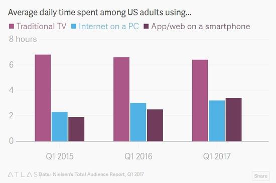 然而,虽然内容消费终端可能发生了改变,但更多的人的内容消费数量比以往任何时候都要多。科技博客Recode指出,随着传统电视收视率下降,包括电脑和智能手机在内的其它设备终端的使用量呈现稳步上升。这些设备可用于做各种看电视以外的事情。尼尔森则估计,在当前的2016至17电视季中,美国观看电视的家庭数量增长1.7%,至1.184亿户。