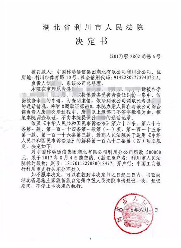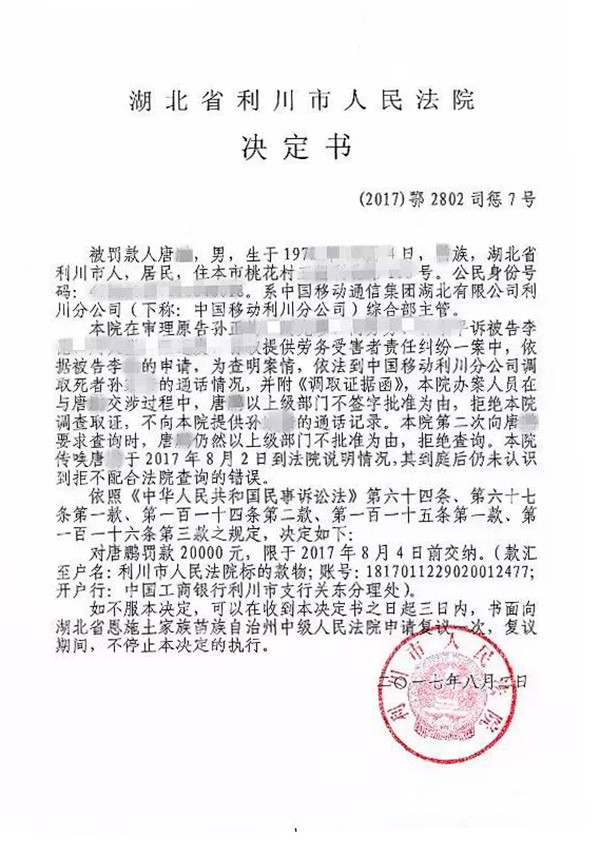 为维护法律权威,根据《中华人民共和国民事诉讼法》规定,利川市法院依法对利川移动公司作出罚款500000元的处罚,对利川移动公司综合部信息查询负责人唐某作出罚款20000元的处罚。